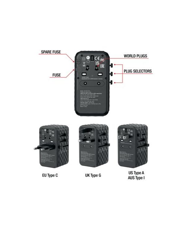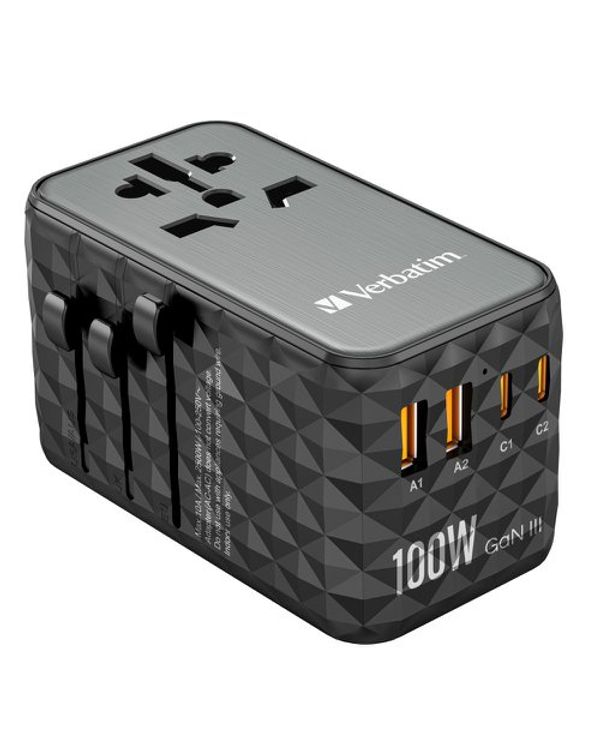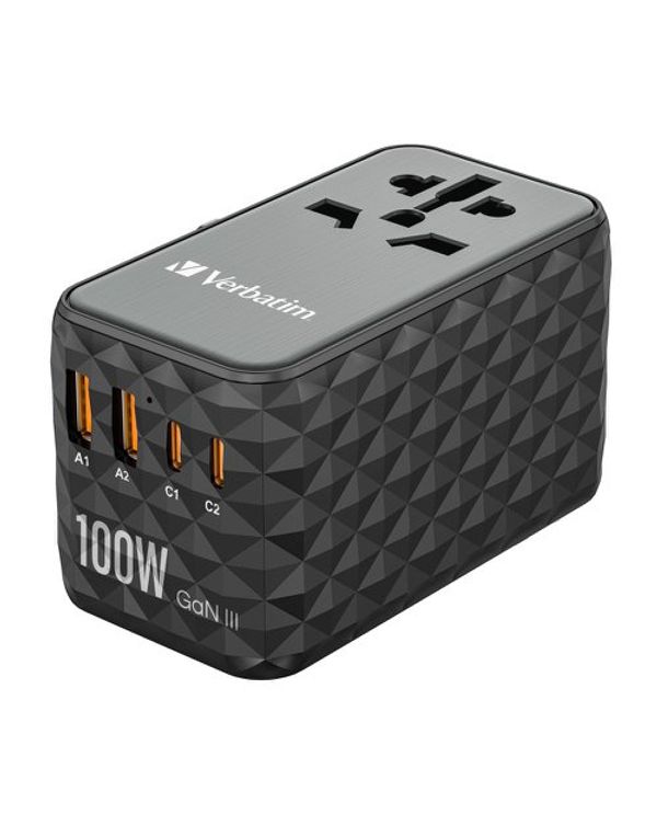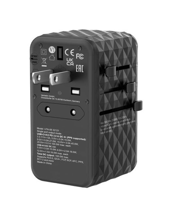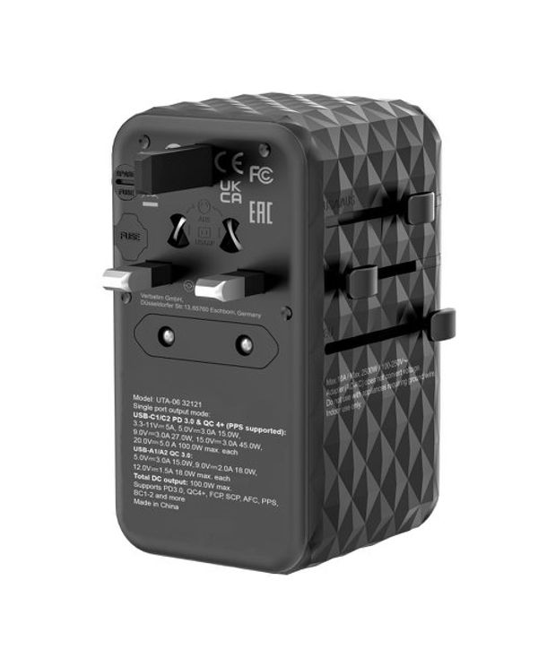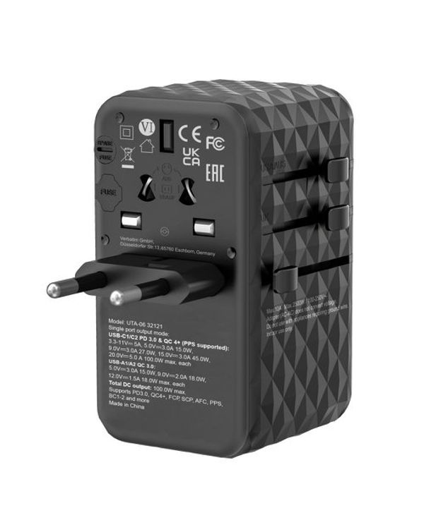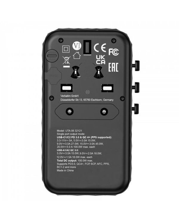 Verbatim UTA-06 GaN III Universal Travel Adapter 2x USB-C PD 100W + QC4+/2x USB-A QC 3.0 Black 32121