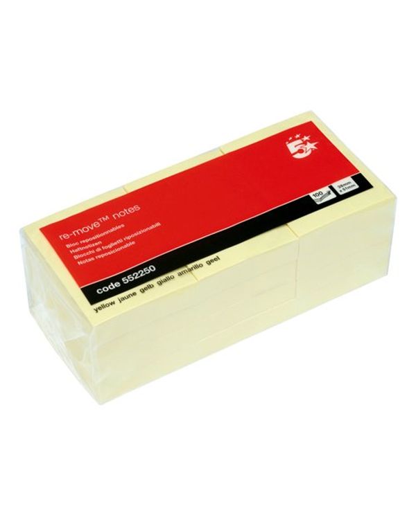 5 Star Re-move Sticky Notes Repositionable 38x51mm Yellow (Pack of 12) 552250