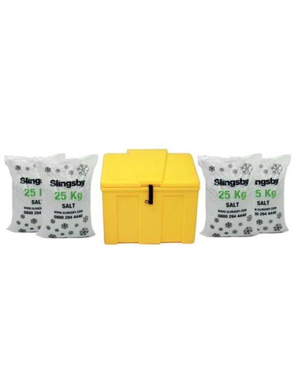 Heavy Duty Lockable Salt and Grit Bin Yellow 110L with White De-icing Salt 395100