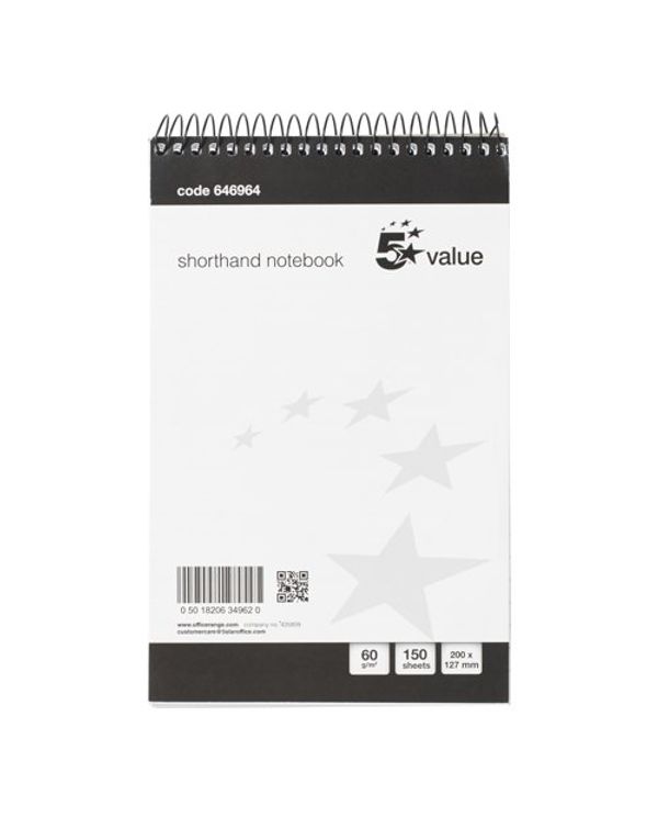 5 Star Shorthand Pad Wirebound 60gsm Ruled 300pp 127x200mm Black/White (Pack of 5)