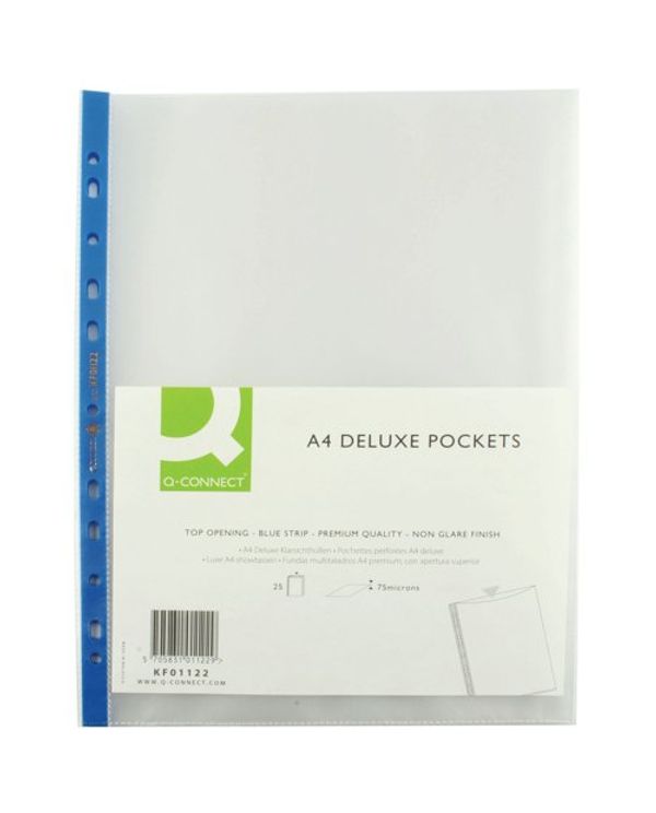 Q-Connect Delux Punched Pocket Top Opening Blue Strip A4 Clear (Pack of 25) KF01122