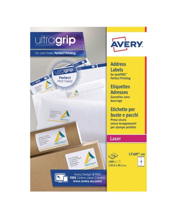 Avery Ultragrip Laser Parcel Labels 139x99.1mm 4 Per Sheet White (Pack of 1000) L7169-250