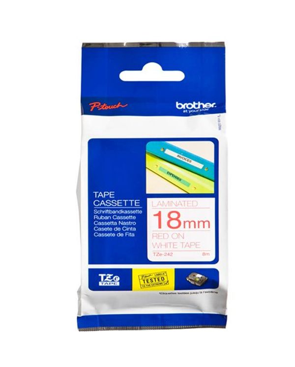 Brother P-Touch TZe Lam Tape Cassette 18mm x 8m Red on White Tape TZE242