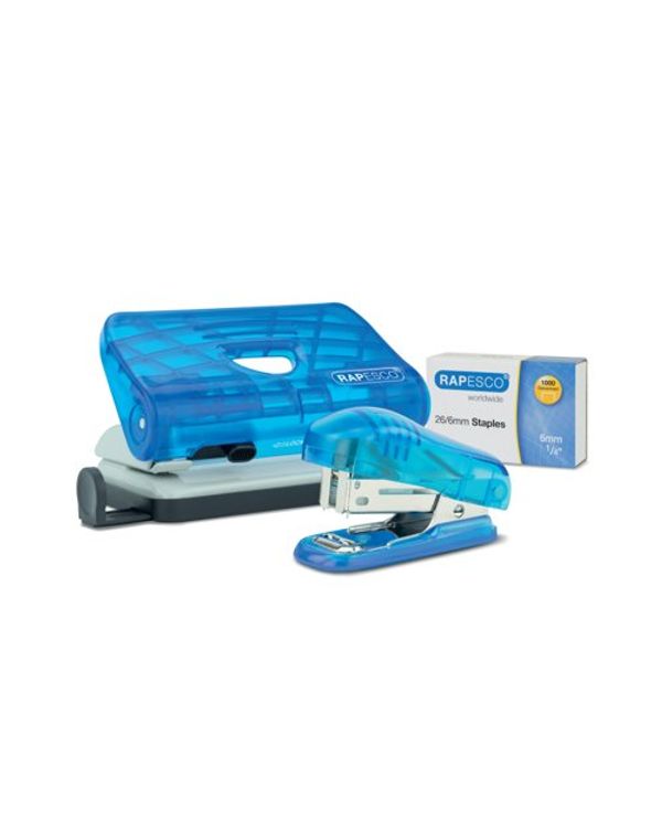 Rapesco 2 Hole Punch Mini Stapler and 26/6mm Staples Set Transparent Blue