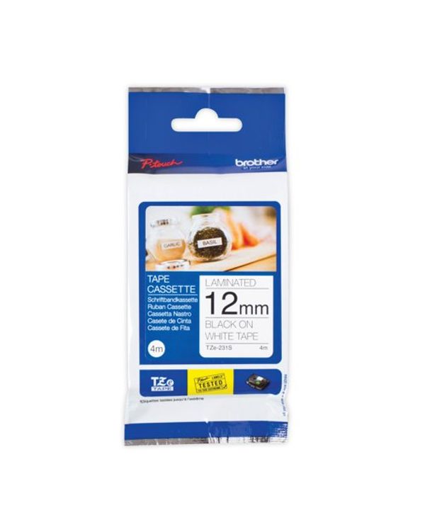 Brother P-Touch TZe Lam Tape Cassette 12mm x 4m Black on White Tape TZE231S2