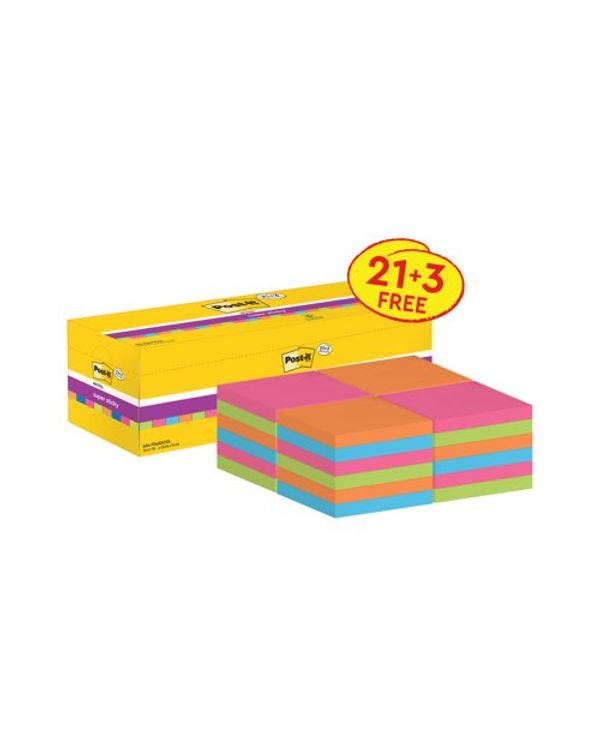 Post-it Super Sticky 76x76mm Assorted VALUE PACK 21 + 3 FREE Pads (Pack of 24) 654-SS-VP24COL-EU