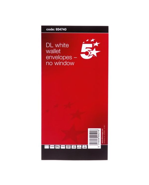 5 Star DL Wallet Envelope Self Seal 80gsm 220x110mm White Retail Pack (Pack of 50) 934740