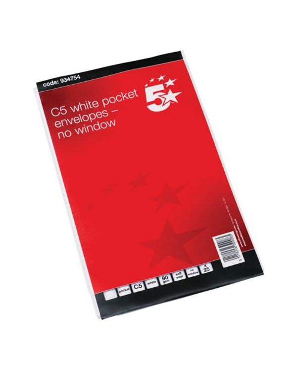 5 Star C5 Pocket Envelope Self Seal 90gsm 229x162mm White Retail Pack (Pack of 25) 934754
