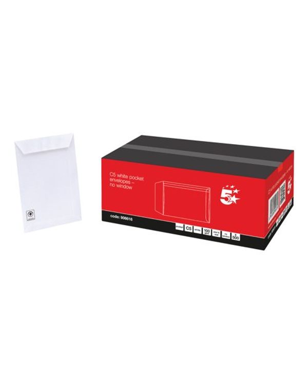 5 Star C5 Pocket Envelope Peel and Seal 100gsm 229x162mm White (Pack of 500) 906616