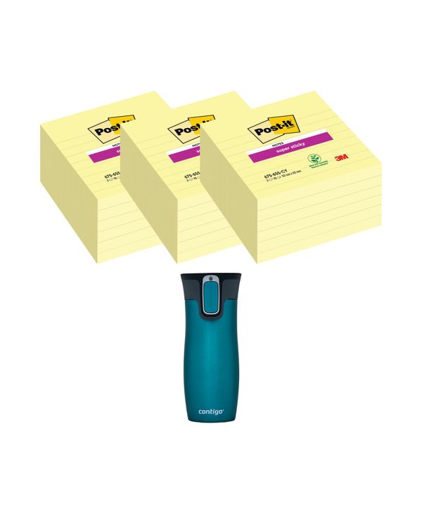 Post-It Super Sticky 101x101mm Lined Yellow 3x6 Pads (Pack of 18) + FOC Contigo Travel Mug
