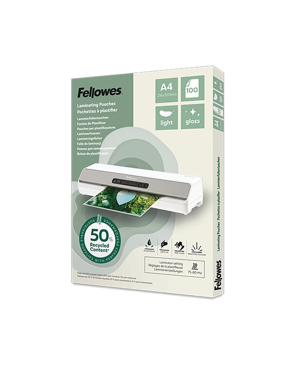 Fellowes Recycled A4 Laminating Pouches Gloss 80 Micron (Pack of 100) 100142987