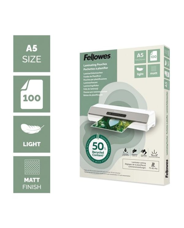 Fellowes Recycled Laminating Pouches 80 Micron A5 Matt (Pack of 100) 100143437
