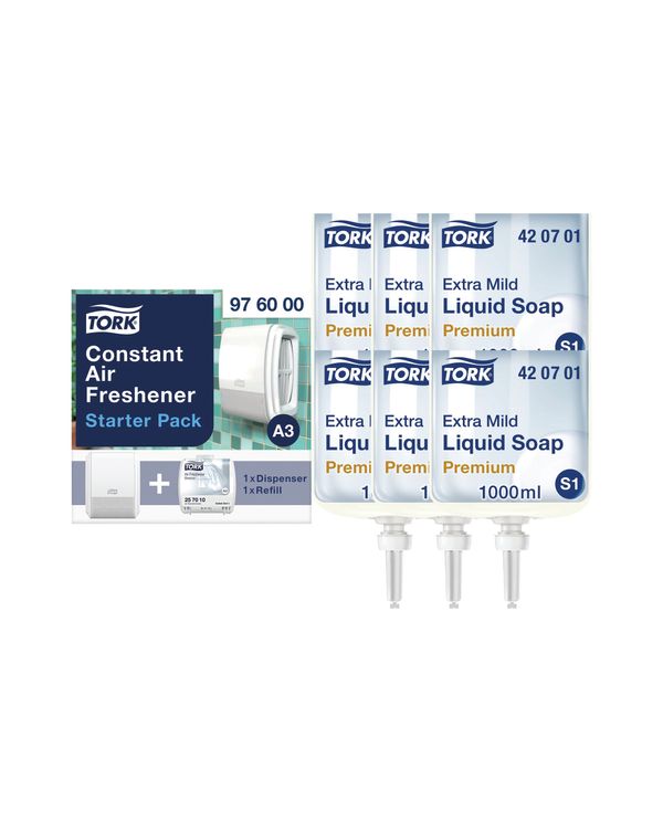 Tork Extra Mild Liquid Soap Refill S1 Non Perfumed 1L (Pack of 6) + FREE Air Freshener Pack