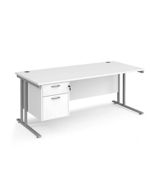 Maestro 25 straight desk 1800mm x 800mm with 2 drawer pedestal - silver cantilever leg frame, white top