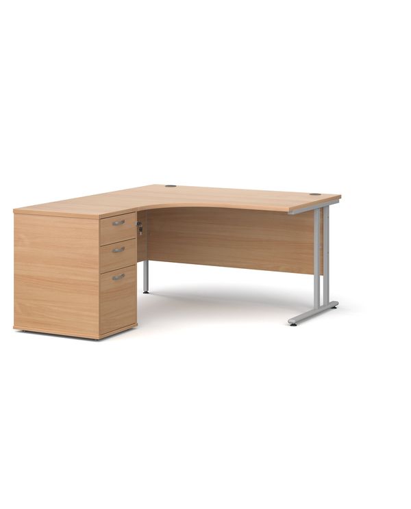 Maestro 25 left hand ergonomic desk 1400mm with silver cantilever frame and desk high pedestal - beech