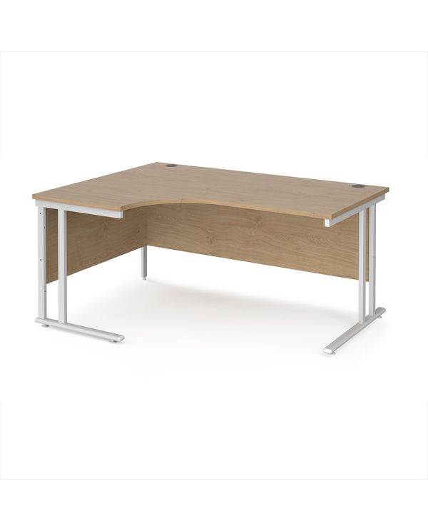 Maestro 25 left hand ergonomic desk 1600mm wide - white cantilever leg frame, Kendal oak top