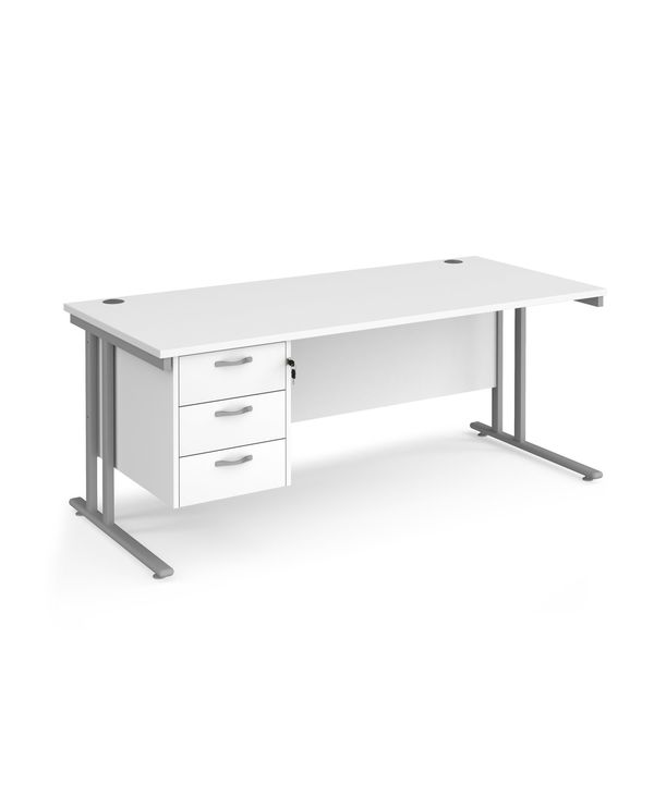 Maestro 25 straight desk 1800mm x 800mm with 3 drawer pedestal - silver cantilever leg frame, white top