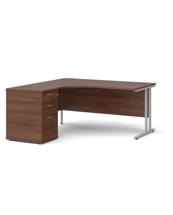 Maestro 25 left hand ergonomic desk 1600mm with silver cantilever frame and desk high pedestal - walnut