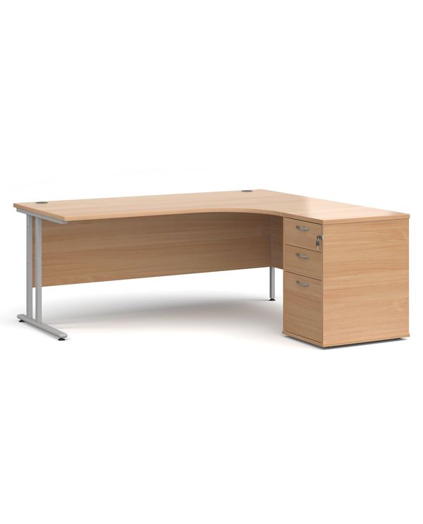 Maestro 25 right hand ergonomic desk 1800mm with silver cantilever frame and desk high pedestal - beech