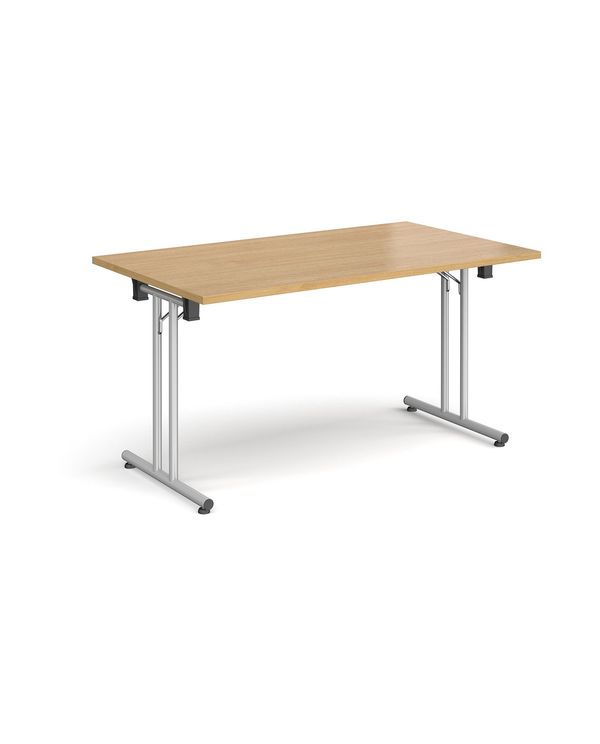 Rectangular folding leg table with silver legs and straight foot rails 1400mm x 800mm - oak