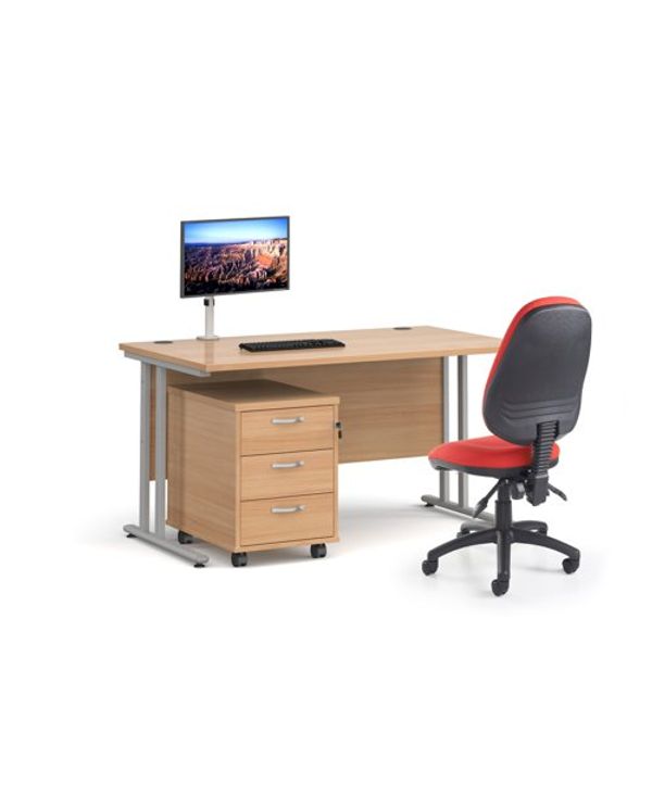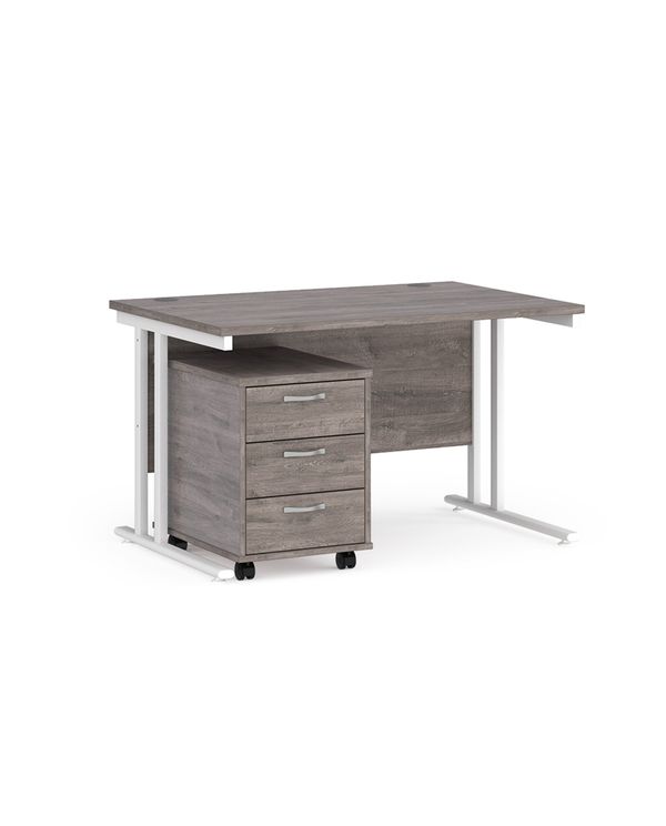 Maestro 25 straight desk 1200mm x 800mm with white cantilever frame and 3 drawer pedestal - grey oak