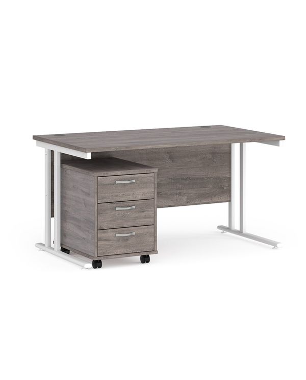 Maestro 25 straight desk 1400mm x 800mm with white cantilever frame and 3 drawer pedestal - grey oak