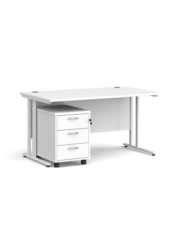 Maestro 25 straight desk 1400mm x 800mm with white cantilever frame and 3 drawer pedestal - white
