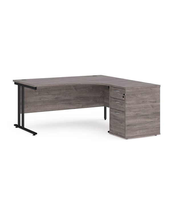 Maestro 25 right hand ergonomic desk 1600mm with black cantilever frame and desk high pedestal - grey oak