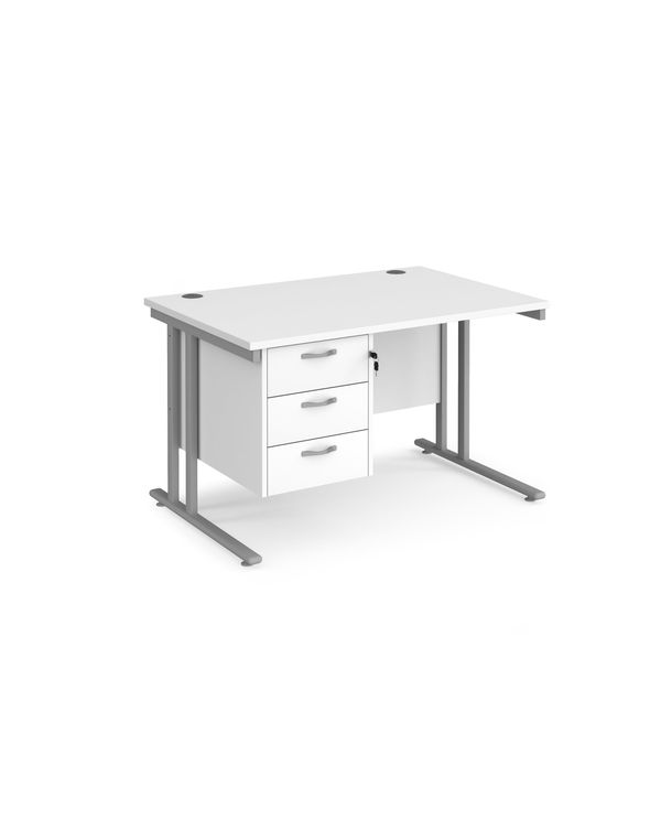 Maestro 25 straight desk 1200mm x 800mm with 3 drawer pedestal - silver cantilever leg frame, white top