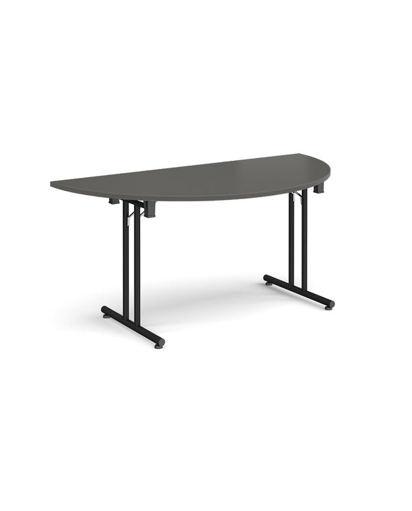 Semi circular folding leg table with black legs and straight foot rails 1600mm x 800mm - Onyx Grey