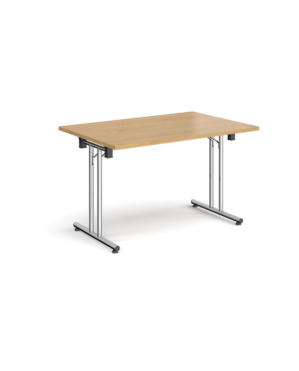 Rectangular folding leg table with chrome legs and straight foot rails 1200mm x 800mm - oak