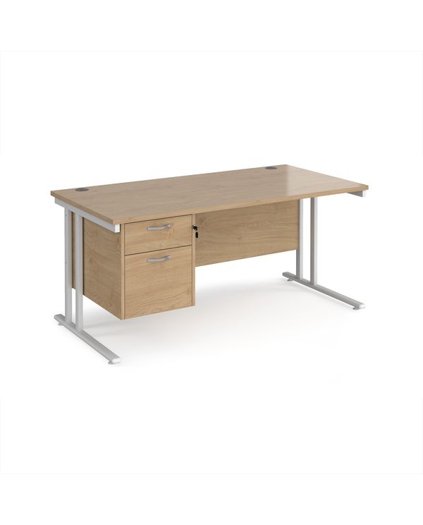 Maestro 25 straight desk 1600mm x 800mm with 2 drawer pedestal - white cantilever leg frame, Kendal oak top