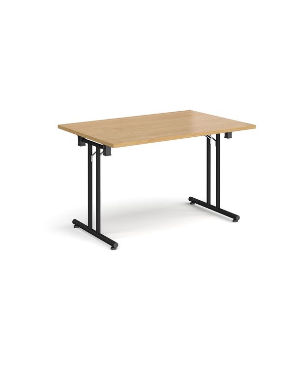 Rectangular folding leg table with black legs and straight foot rails 1200mm x 800mm - oak