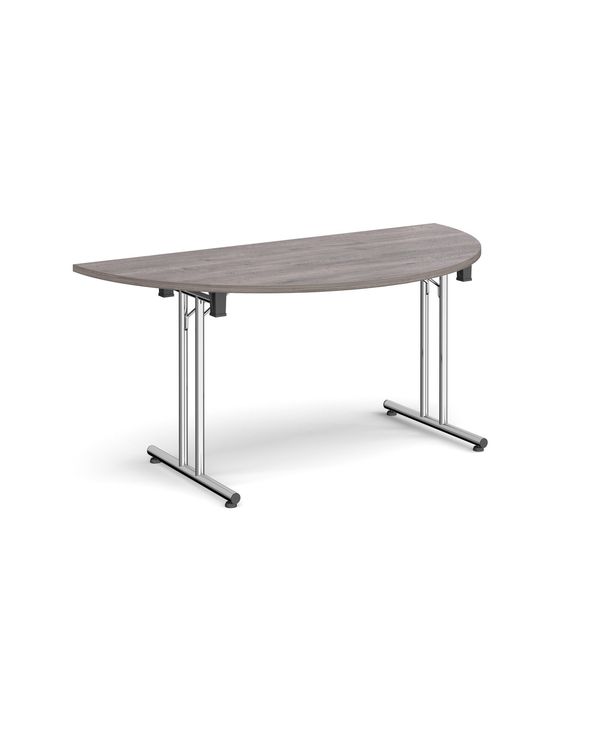 Semi circular folding leg table with chrome legs and straight foot rails 1600mm x 800mm - grey oak