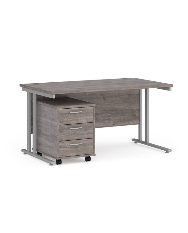 Maestro 25 straight desk 1400mm x 800mm with silver cantilever frame and 3 drawer pedestal - grey oak