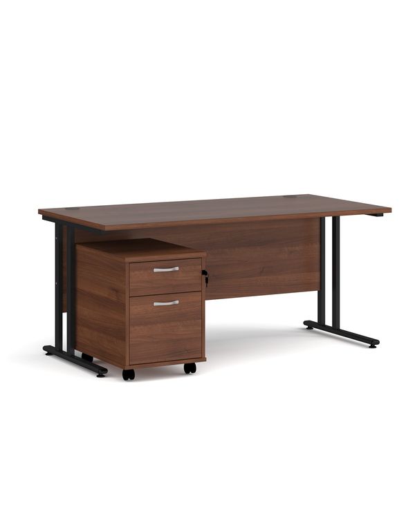 Maestro 25 straight desk 1600mm x 800mm with black cantilever frame and 2 drawer pedestal - walnut