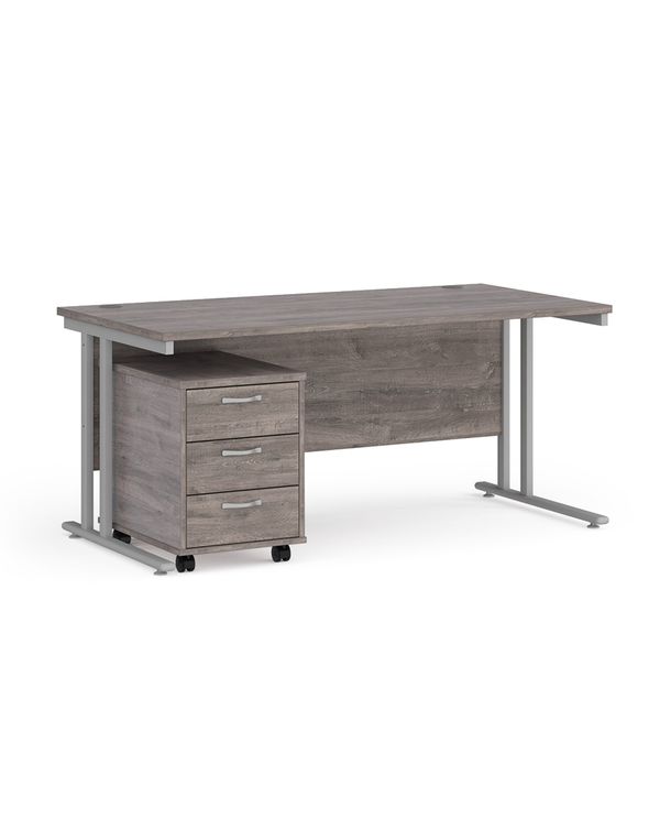 Maestro 25 straight desk 1600mm x 800mm with silver cantilever frame and 3 drawer pedestal - grey oak