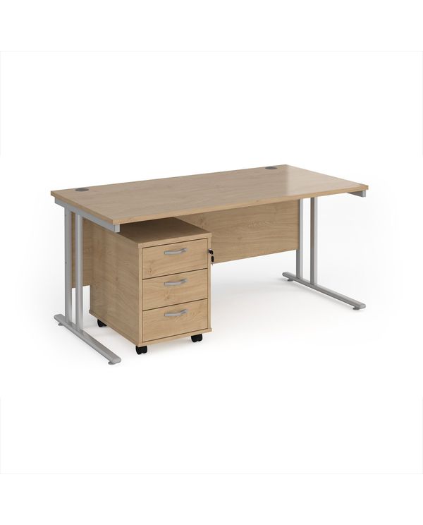 Maestro 25 straight desk 1600mm x 800mm with silver cantilever frame and 3 drawer pedestal - Kendal Oak