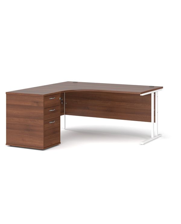 Maestro 25 left hand ergonomic desk 1600mm with white cantilever frame and desk high pedestal - walnut
