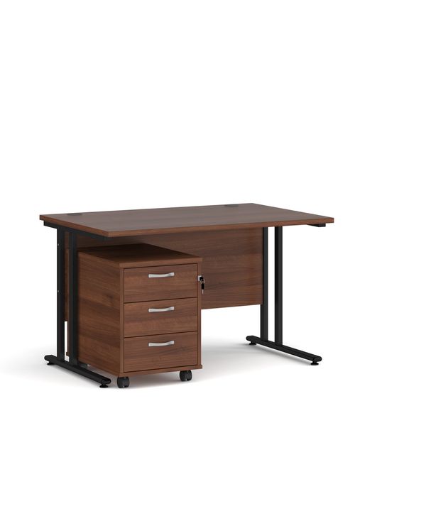 Maestro 25 straight desk 1200mm x 800mm with black cantilever frame and 3 drawer pedestal - walnut