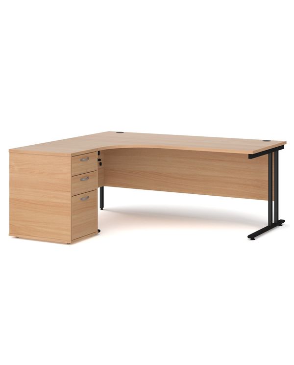 Maestro 25 left hand ergonomic desk 1800mm with black cantilever frame and desk high pedestal - beech