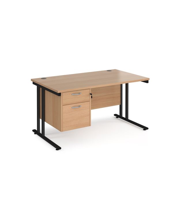 Maestro 25 straight desk 1400mm x 800mm with 2 drawer pedestal - black cantilever leg frame, beech top