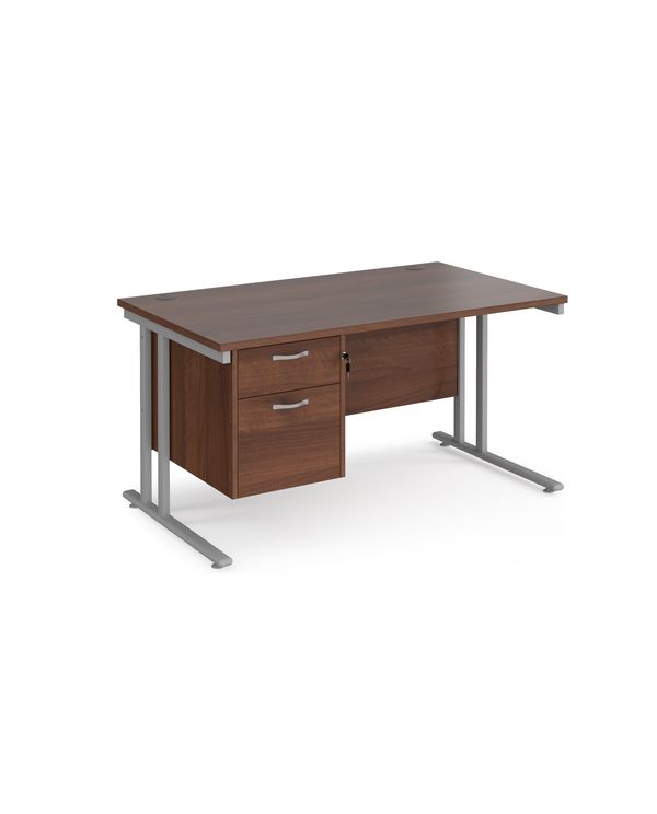 Maestro 25 straight desk 1400mm x 800mm with 2 drawer pedestal - silver cantilever leg frame, walnut top