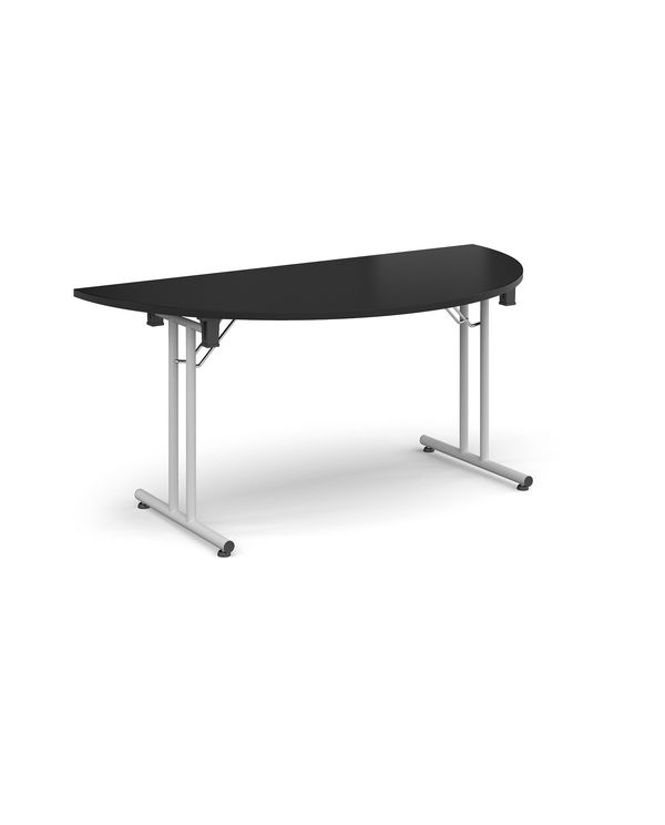 Semi circular folding leg table with white legs and straight foot rails 1600mm x 800mm - Black