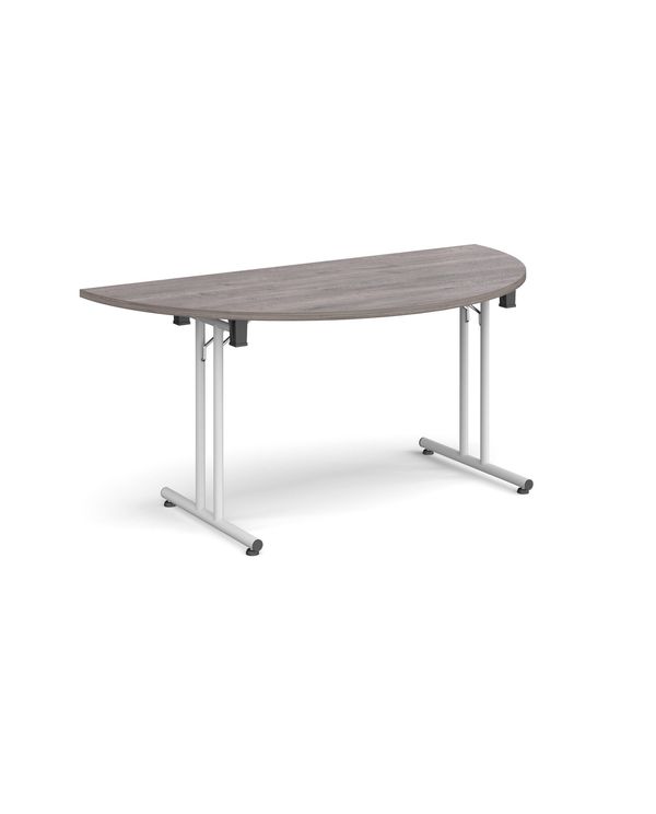 Semi circular folding leg table with white legs and straight foot rails 1600mm x 800mm - grey oak