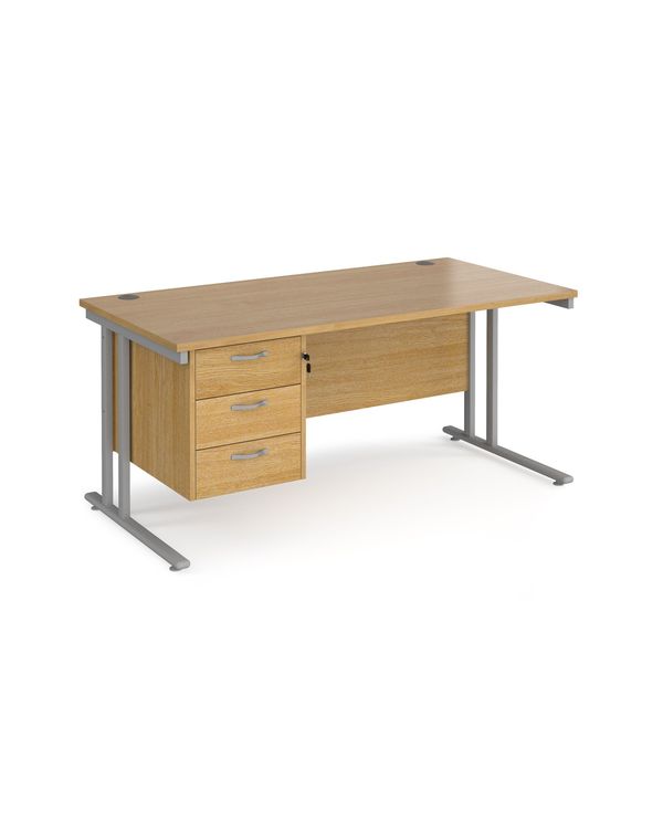 Maestro 25 straight desk 1600mm x 800mm with 3 drawer pedestal - silver cantilever leg frame, oak top