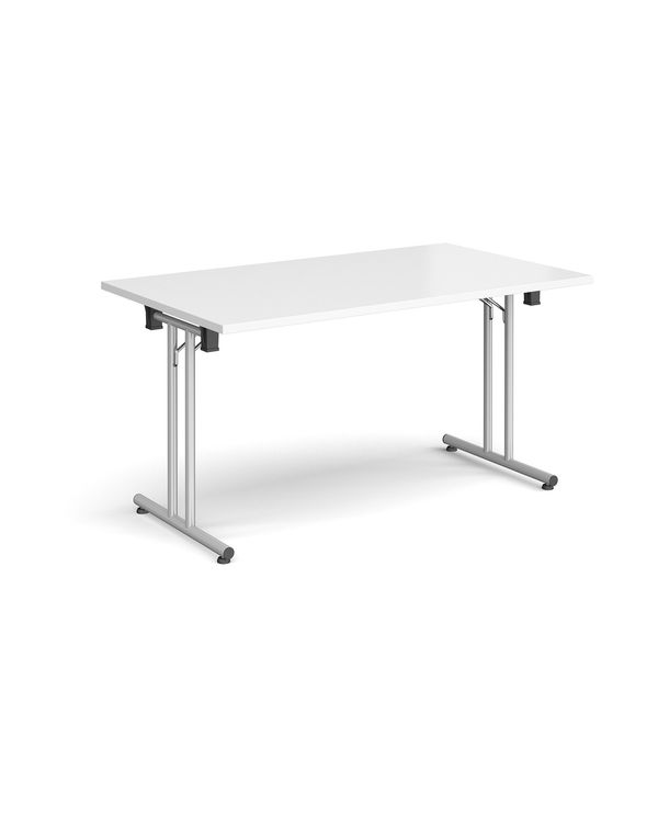 Rectangular folding leg table with silver legs and straight foot rails 1400mm x 800mm - white