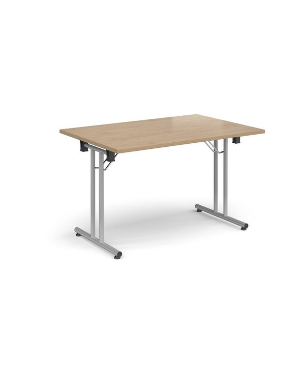 Rectangular folding leg table with silver legs and straight foot rails 1200mm x 800mm - Kendal Oak
