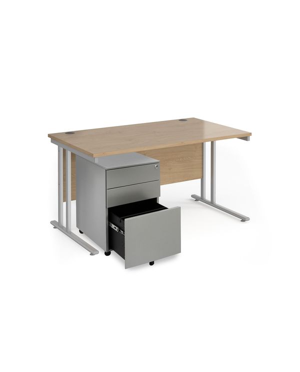 Maestro 25 bundle straight 1400 desk, silver leg frame and silver steel ped - Kendal Oak